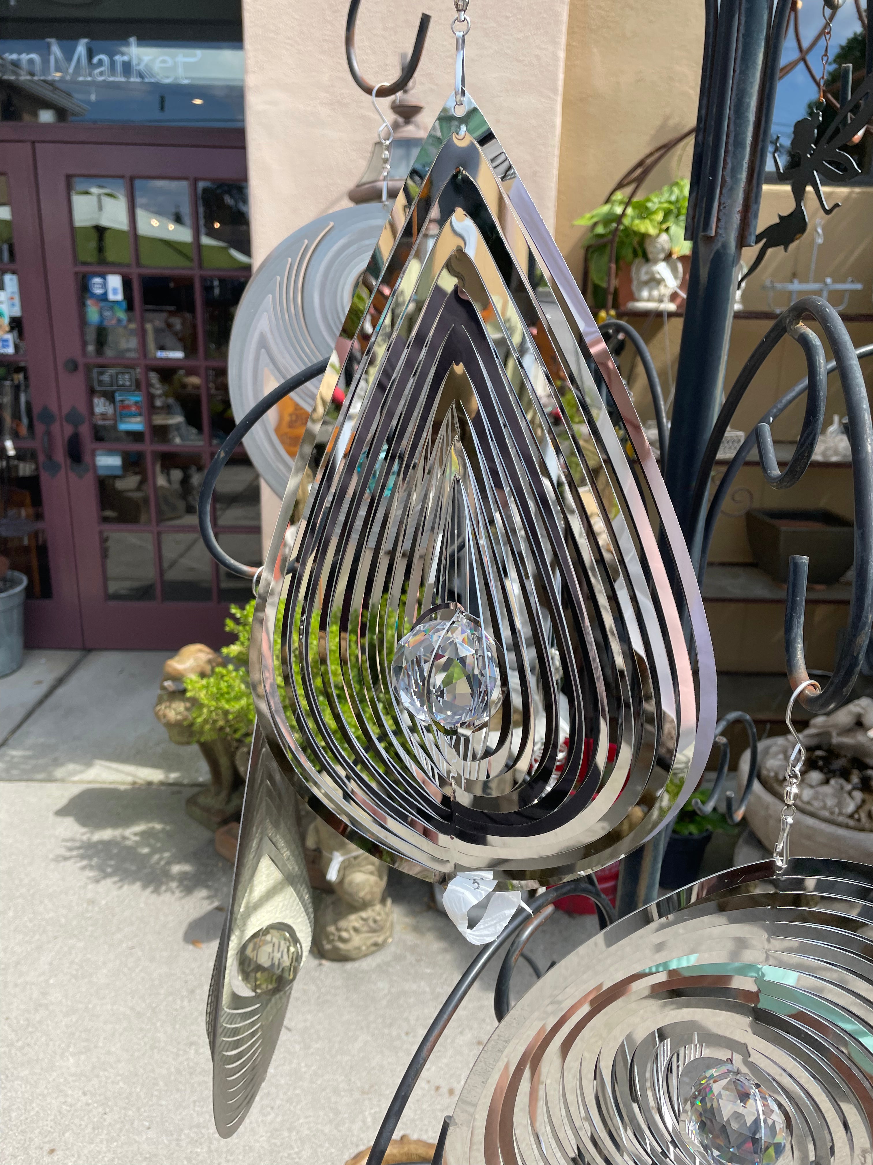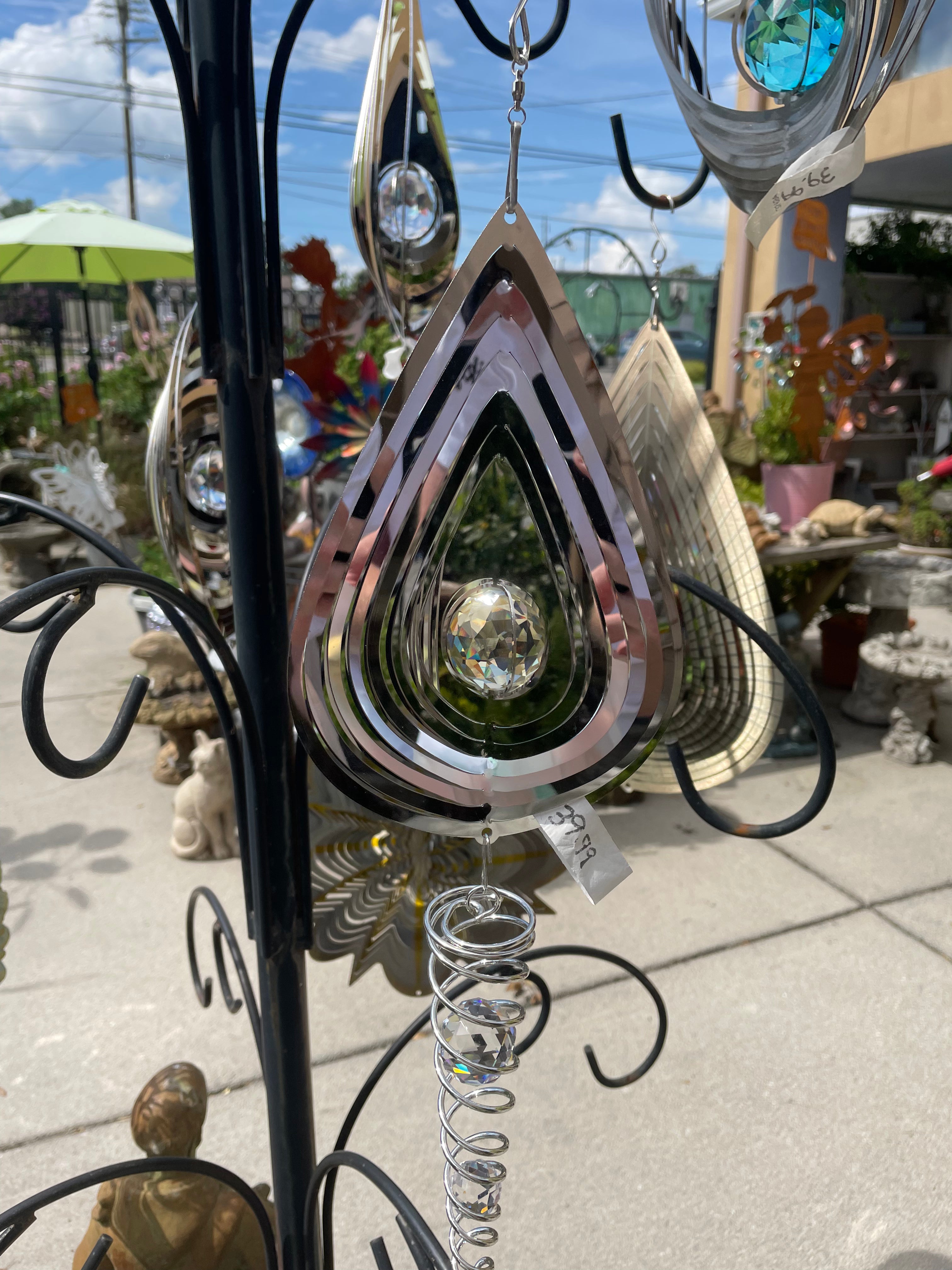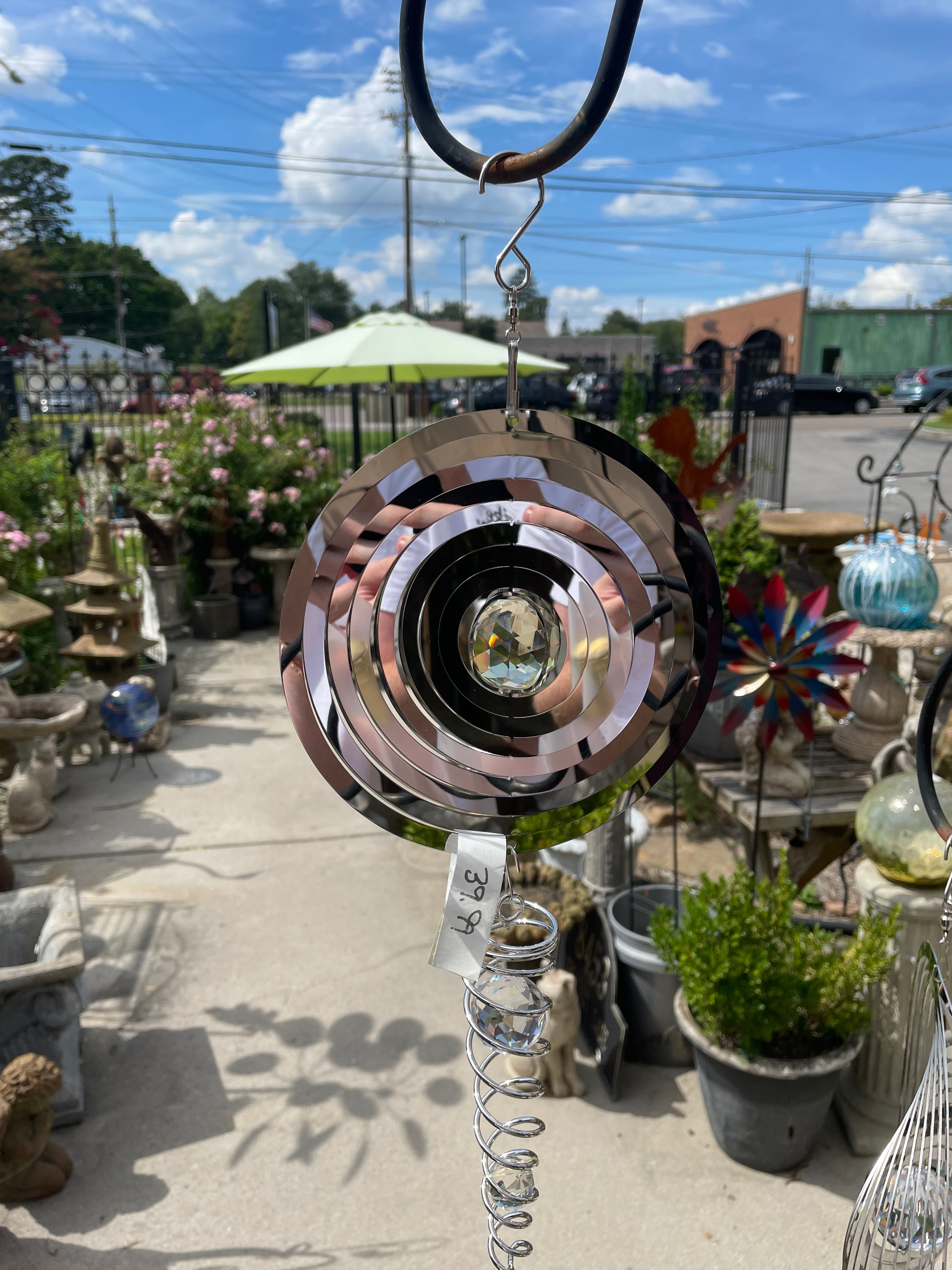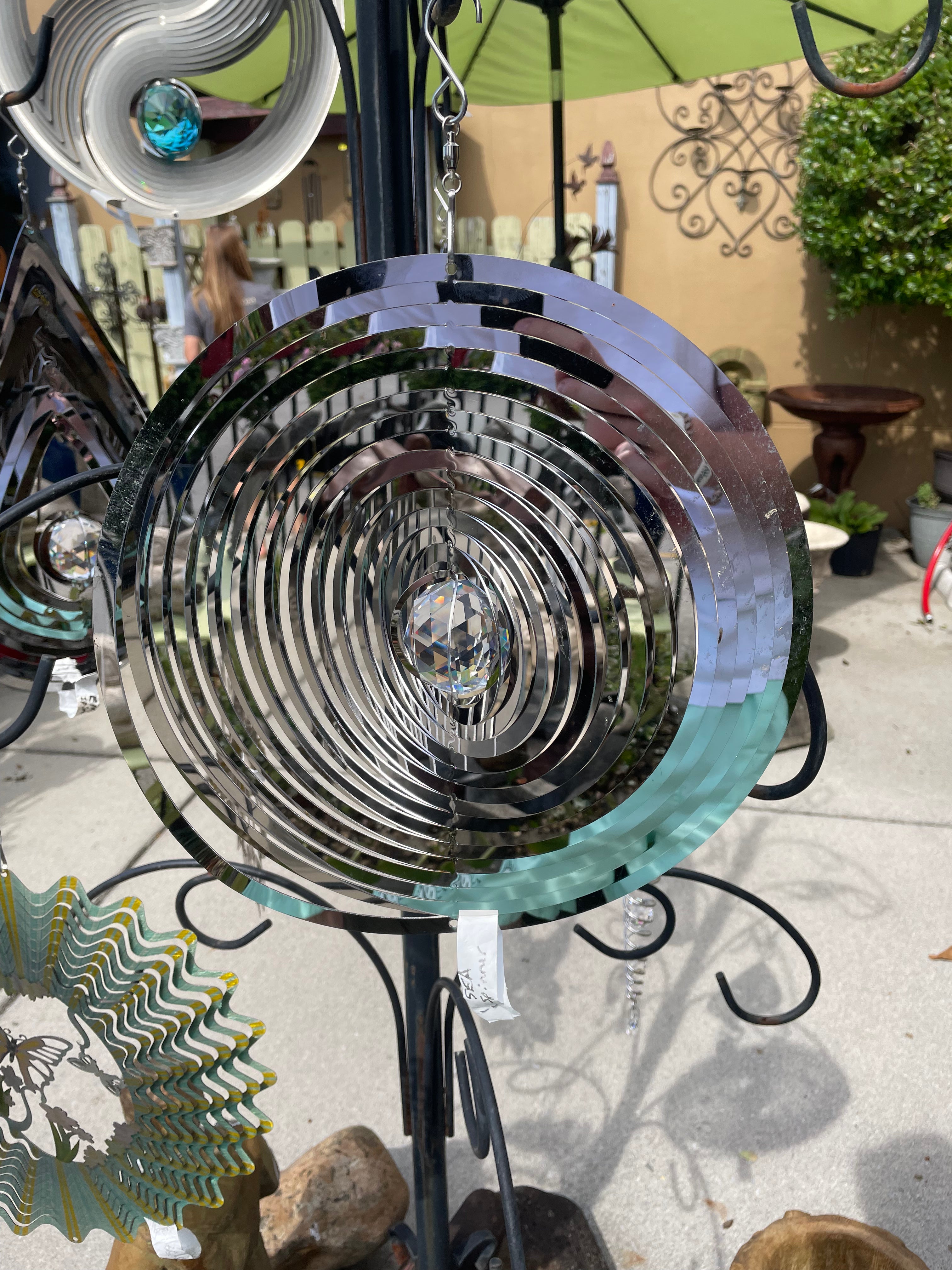 Mirrored garden wind spinners. Metal and Colorful spinners that are sure to spruce your garden up! Circular w/ 2 Blue Spheres - 12" diameter, 22.7 oz...