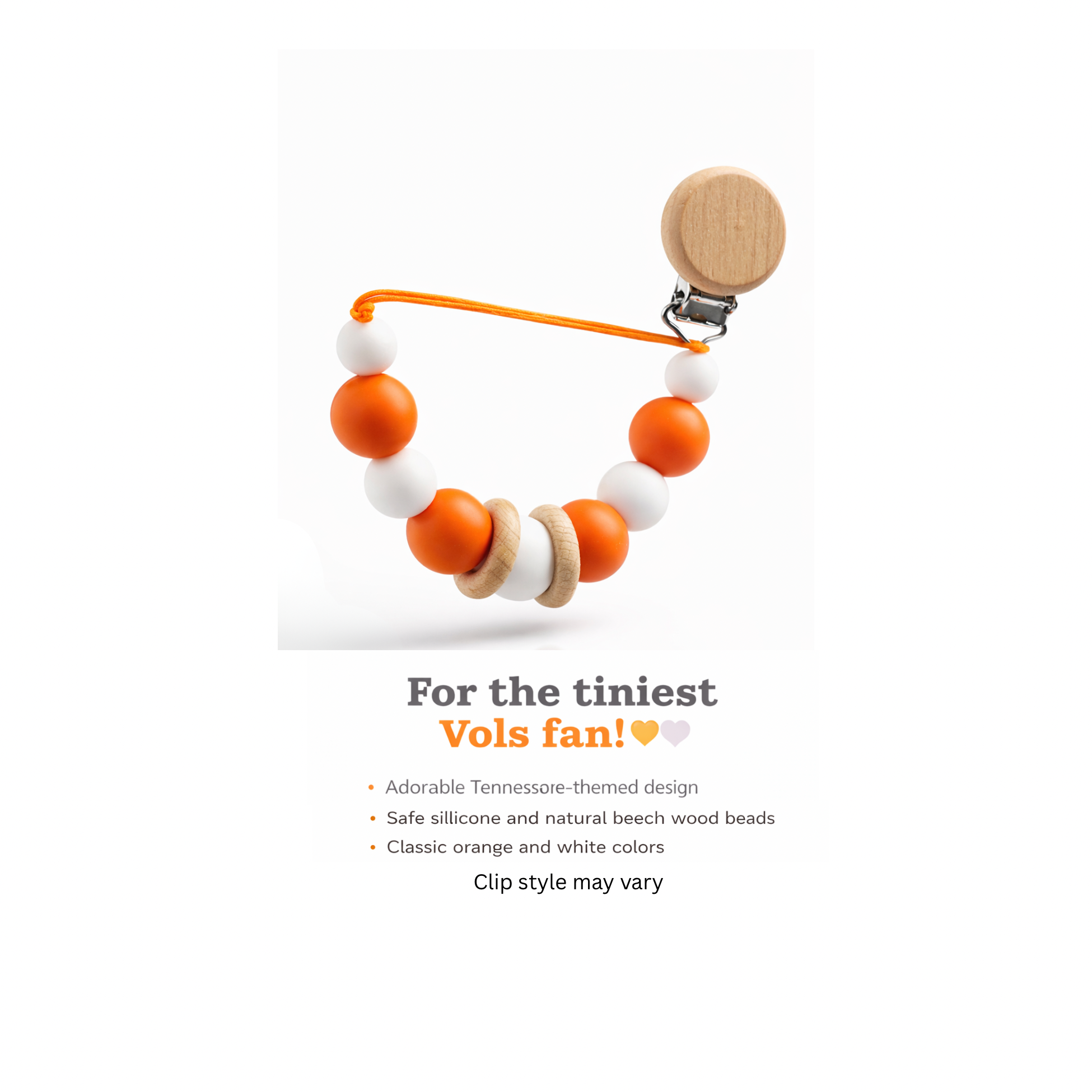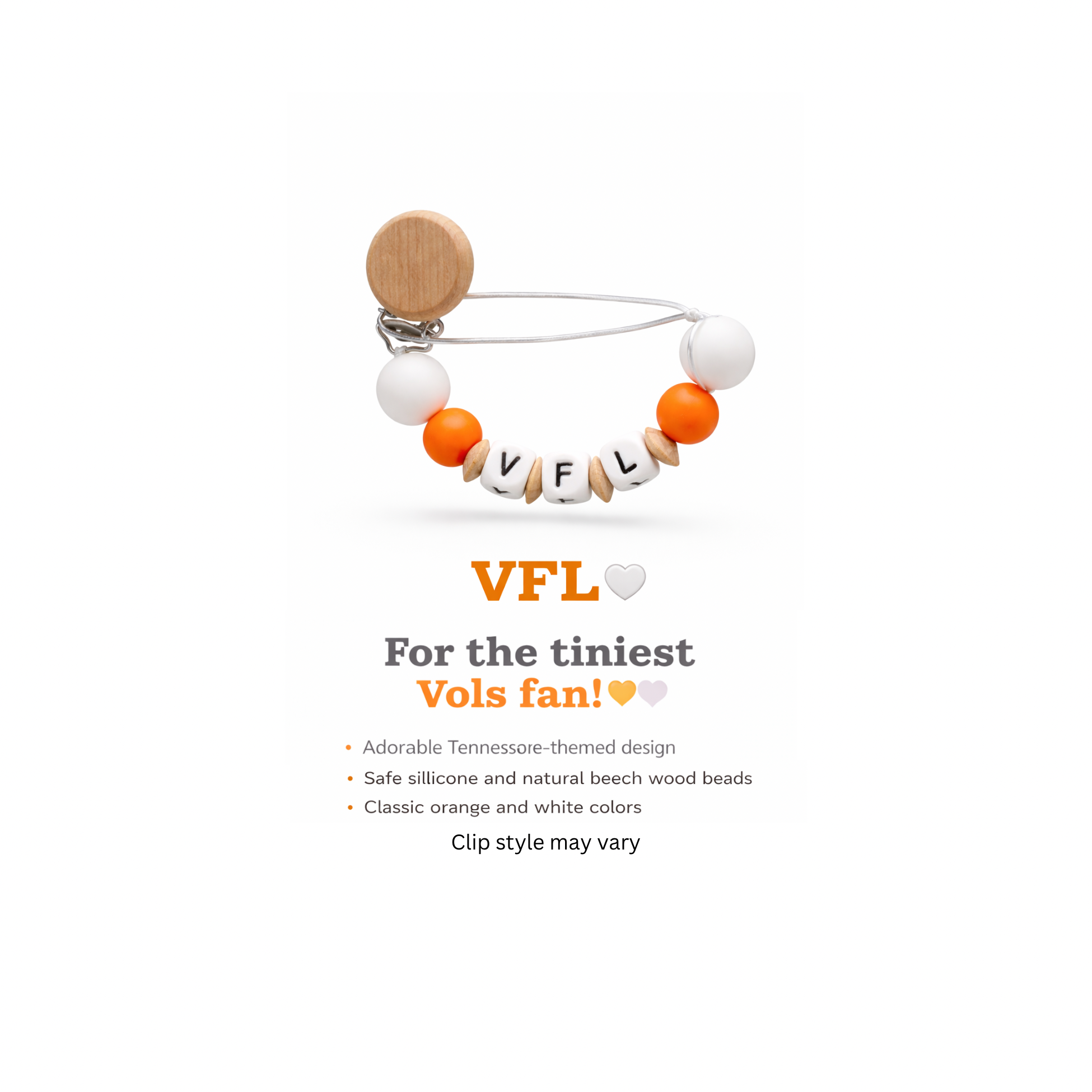 For the tiniest Vols fan! 🧡🤍• Adorable Tennessee themed design• Safe silicone and natural beech wood beads• Classic orange and white colors* Clip style may vary*