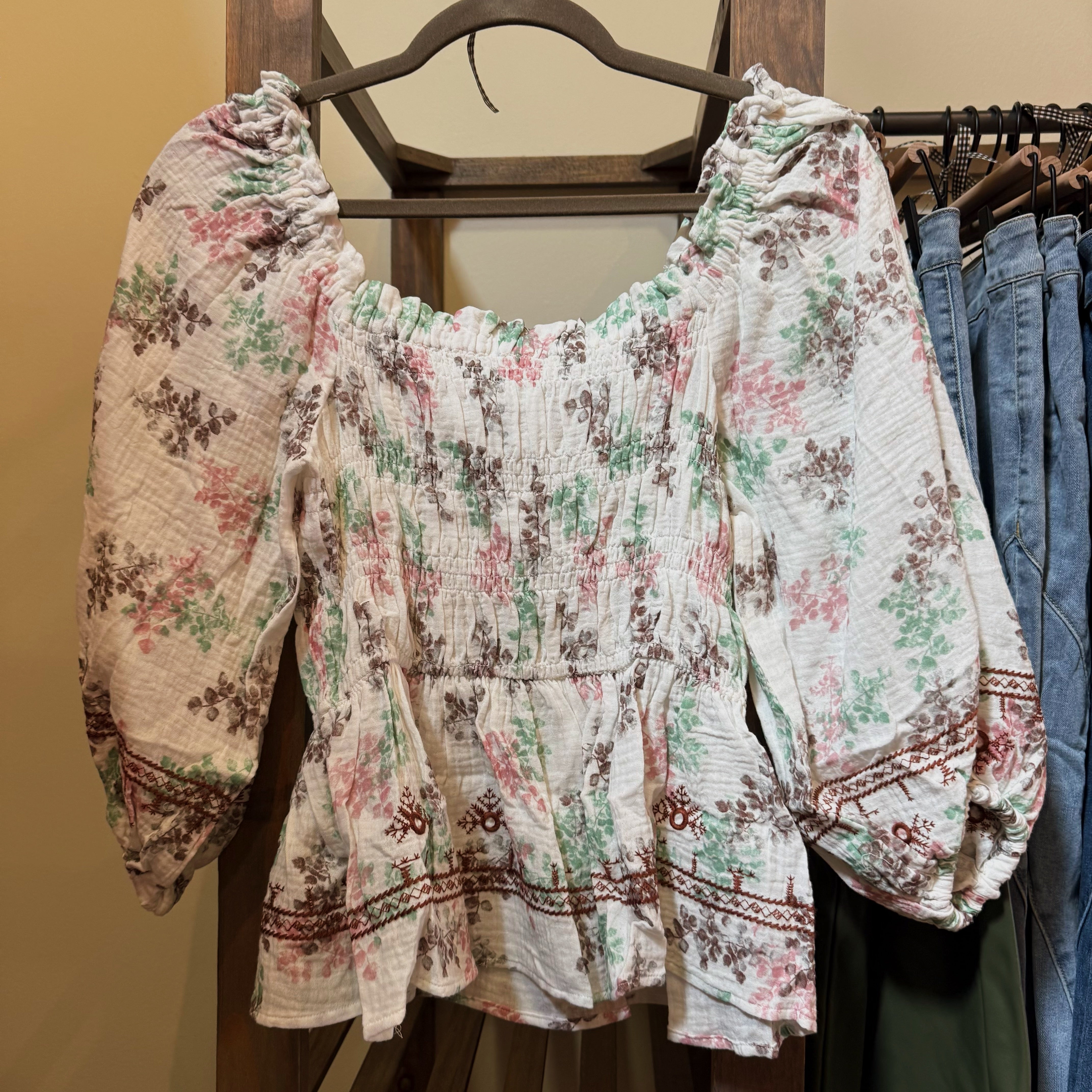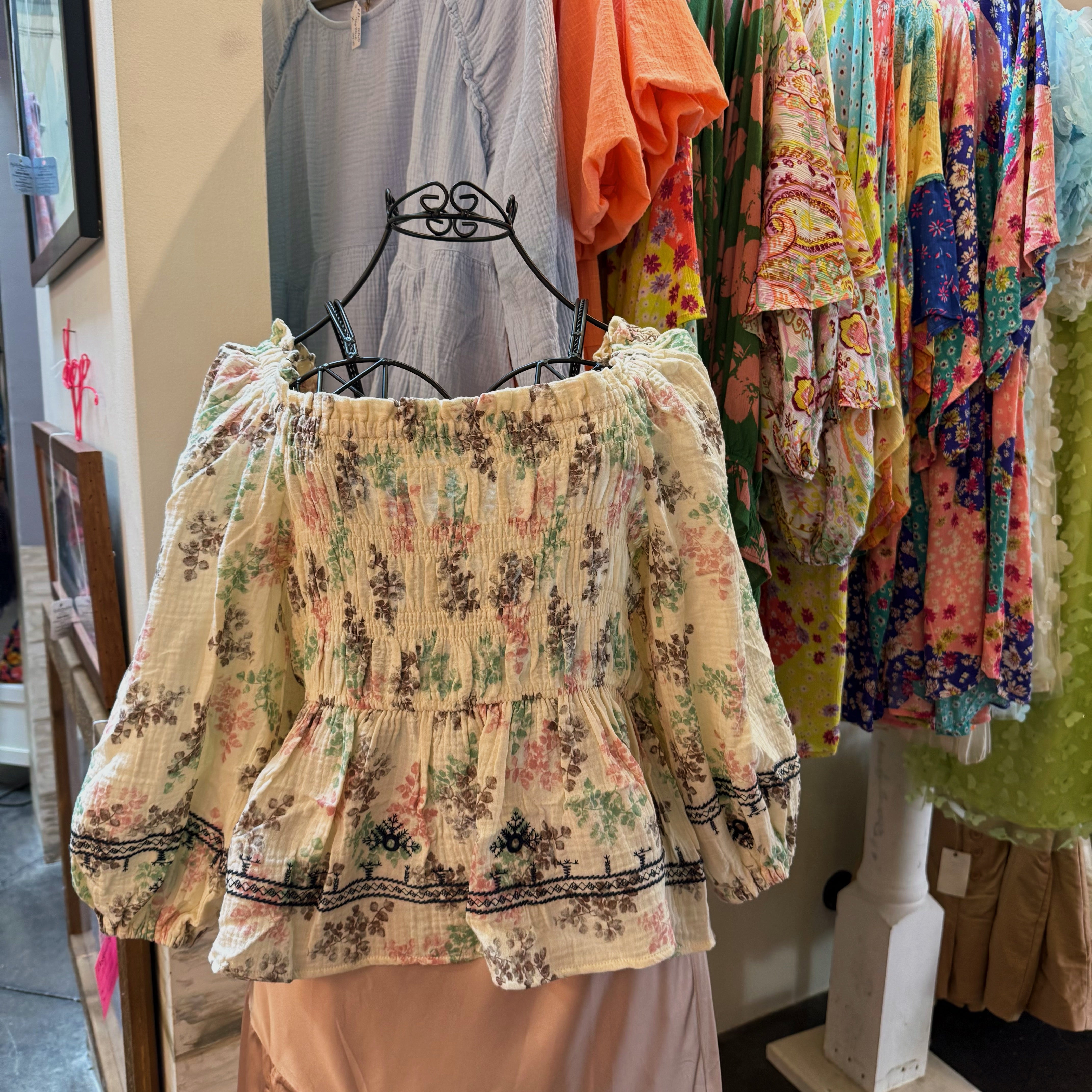Square neckline, floral peplum top. The perfect light weight long sleeve with decorative embroidery on hems and cuffs.