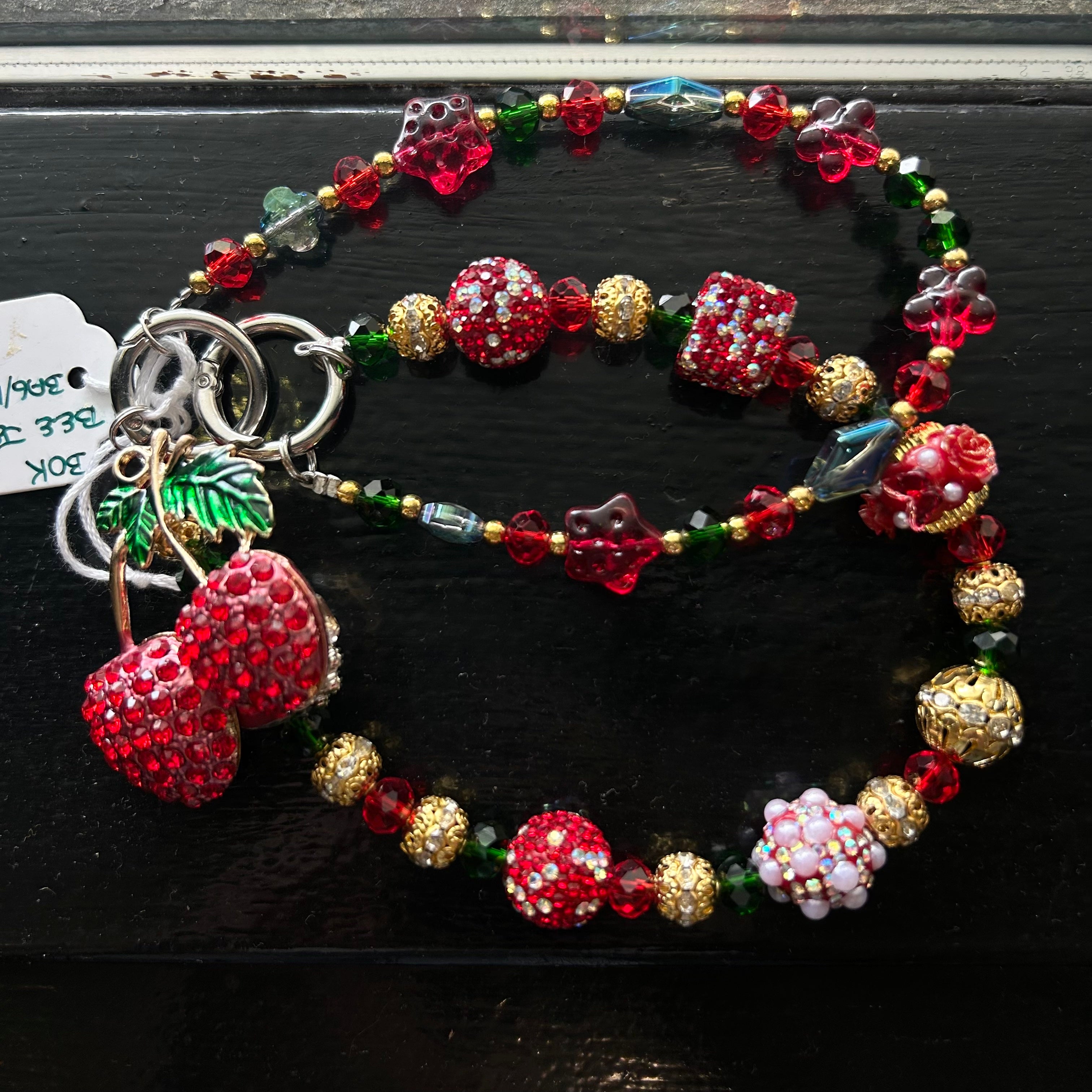Fun bag or key chains available in three styles: cherry, strawberry, or brown and gold. Each measures approximately 12 inches long when unhooked. Perfect for adding...