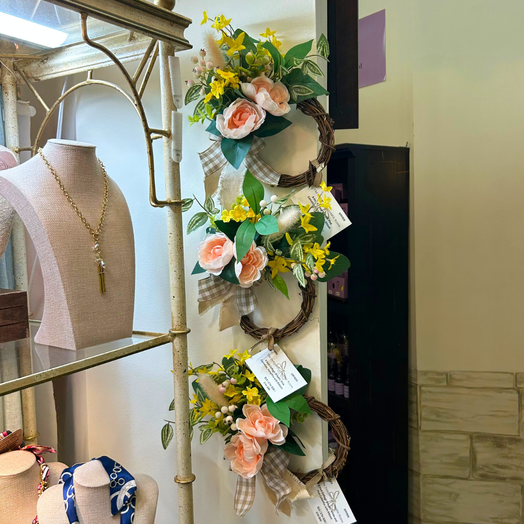 8" Cottage Wreath – Pink Camellia; Forsythia with Ribbon