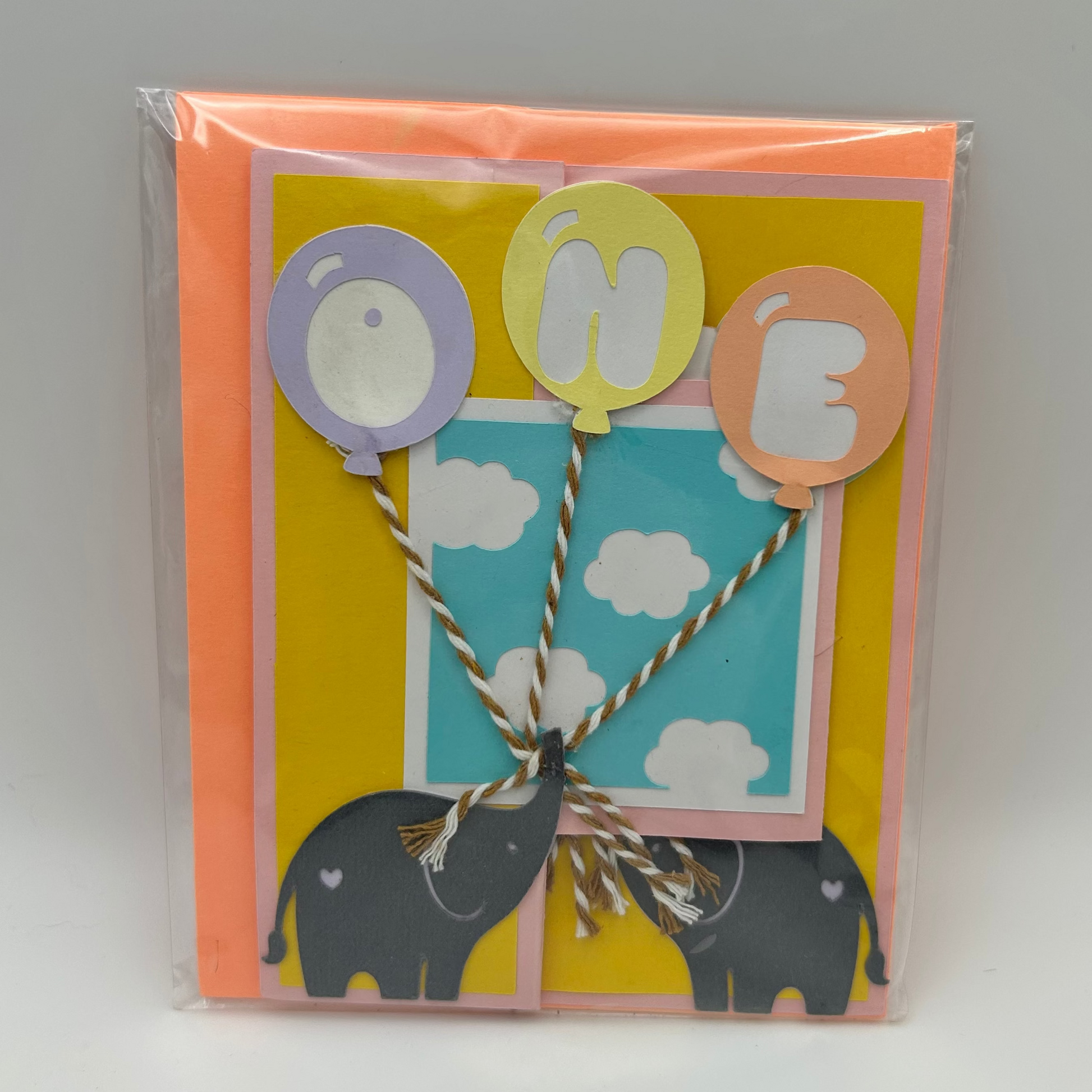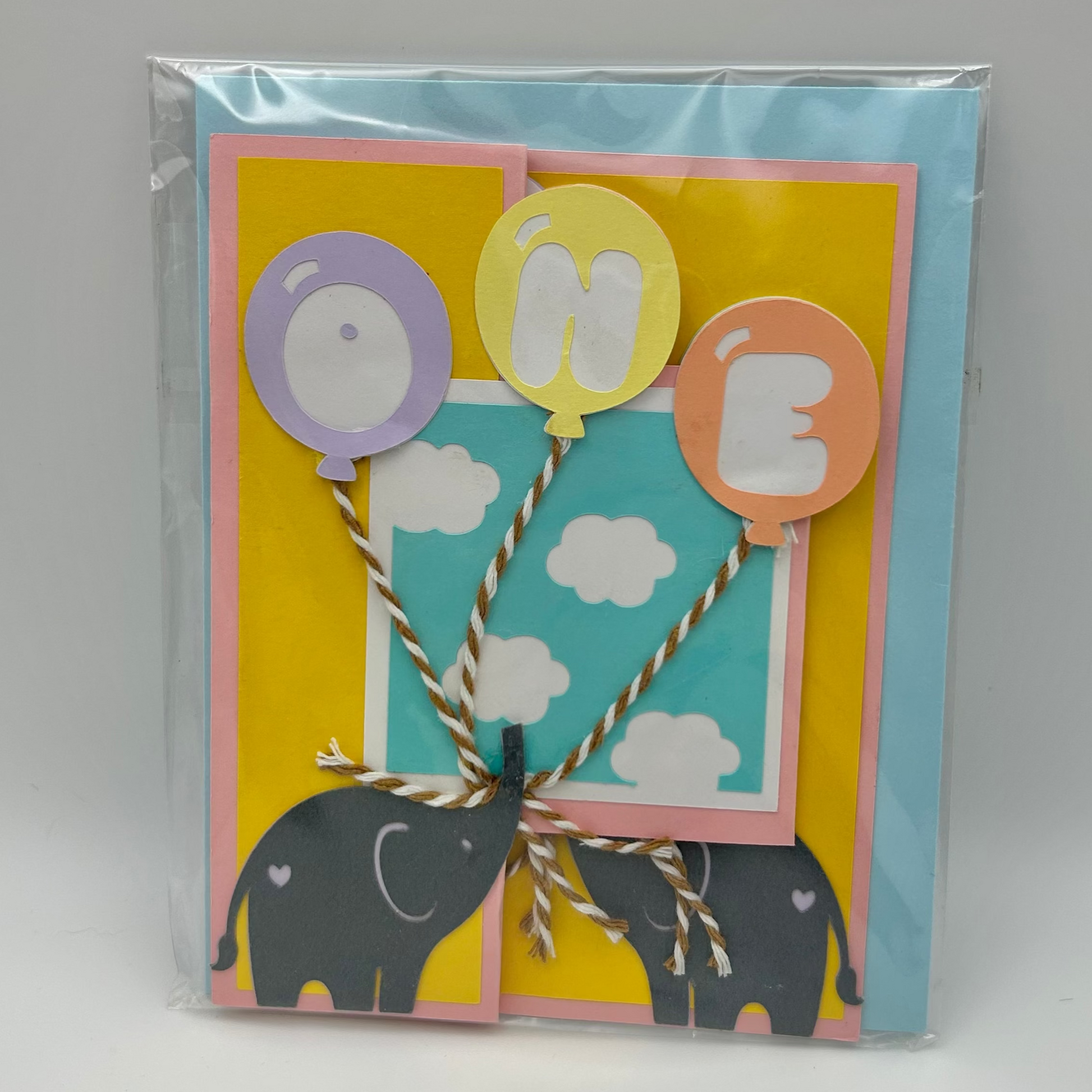 Pop-Up Birthday Card (for 1-Year-Old) features adorable elephants and balloons. Available with either a blue envelope or a coral envelope.