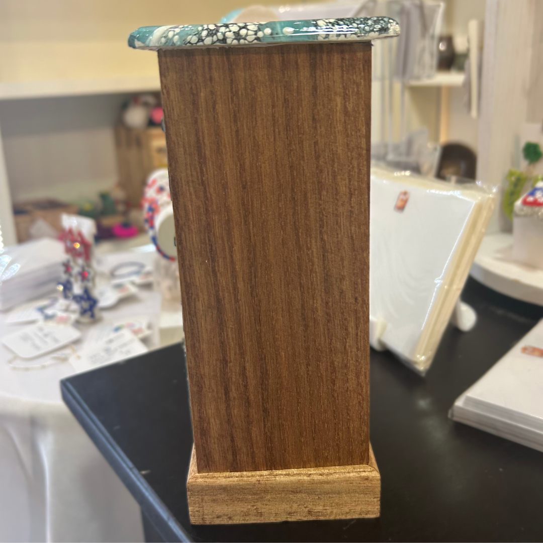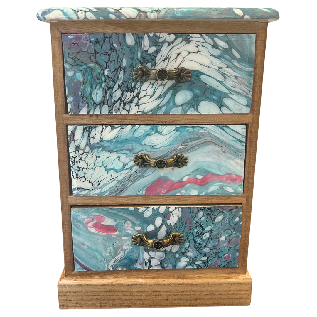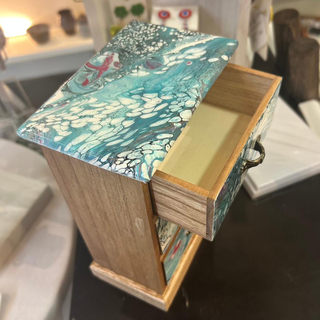 This one-of-a-kind jewelry box is hand-painted in a teal, white, and pink acrylic pour design, finished with a glossy epoxy resin seal for lasting shine and durability.