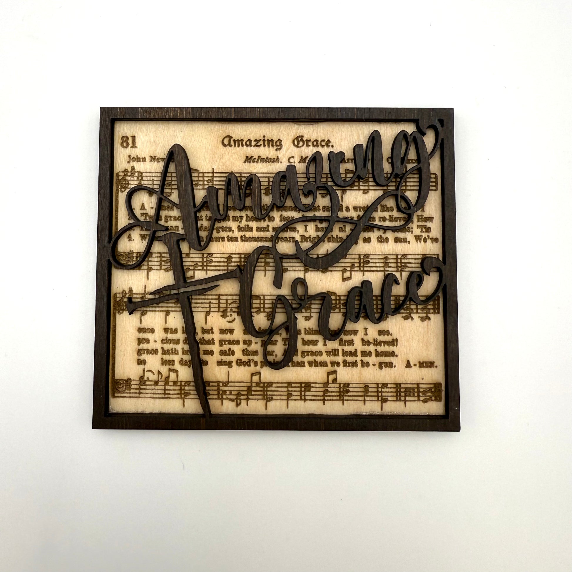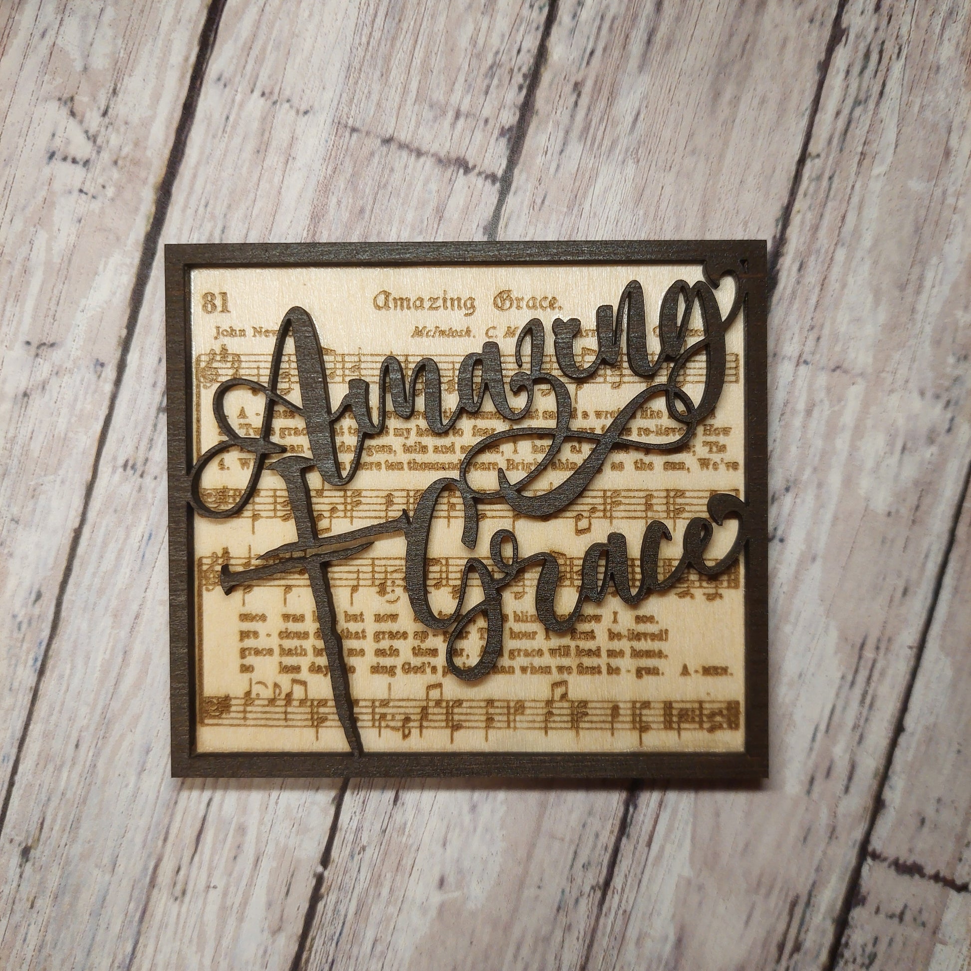 This 4-inch wooden magnet features the hymn "Amazing Grace" beautifully displayed behind nail cross arranged in a unique design.