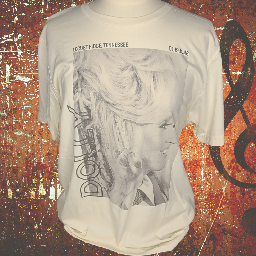 Ultra soft, vintage style Dolly t-shirt, featuring a lovely profile of Dolly, the name of her home area in Sevierville (Locust Ridge) and her birthdate. Great gift idea for anyone who loves everything Dolly!