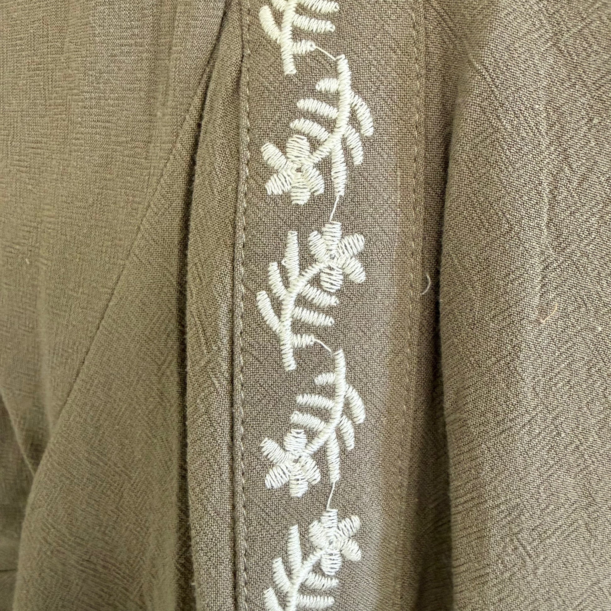Long kimono sleeves, square neckline, ruched shoulders and bottom, floral pattern embroidery. Relaxed and loose fit, flowy silhouette. Woven fabric, 85% Rayon 15% Linen