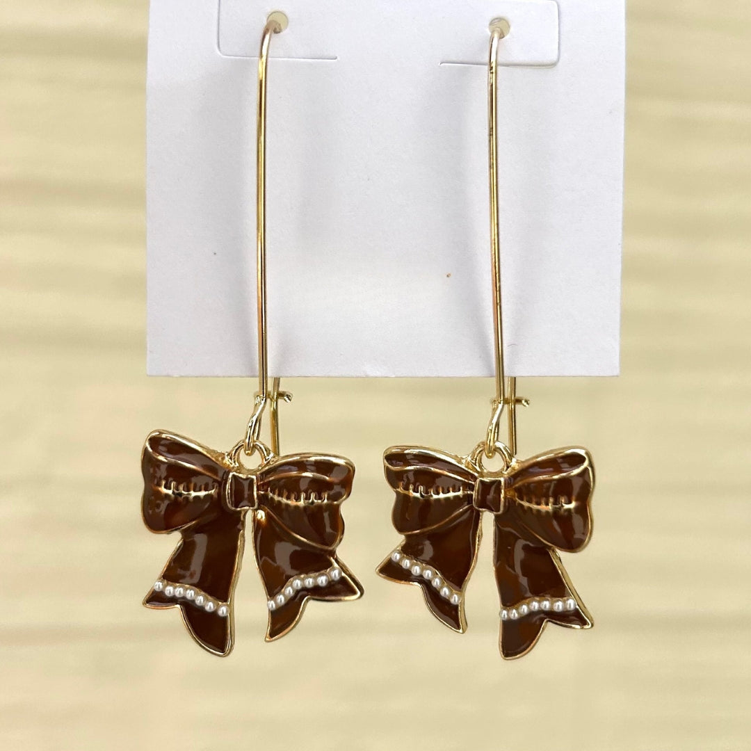Show your team spirit with these playful bow-shaped earrings featuring a football pattern. Lightweight and dangly, they’re the perfect game day accessory.