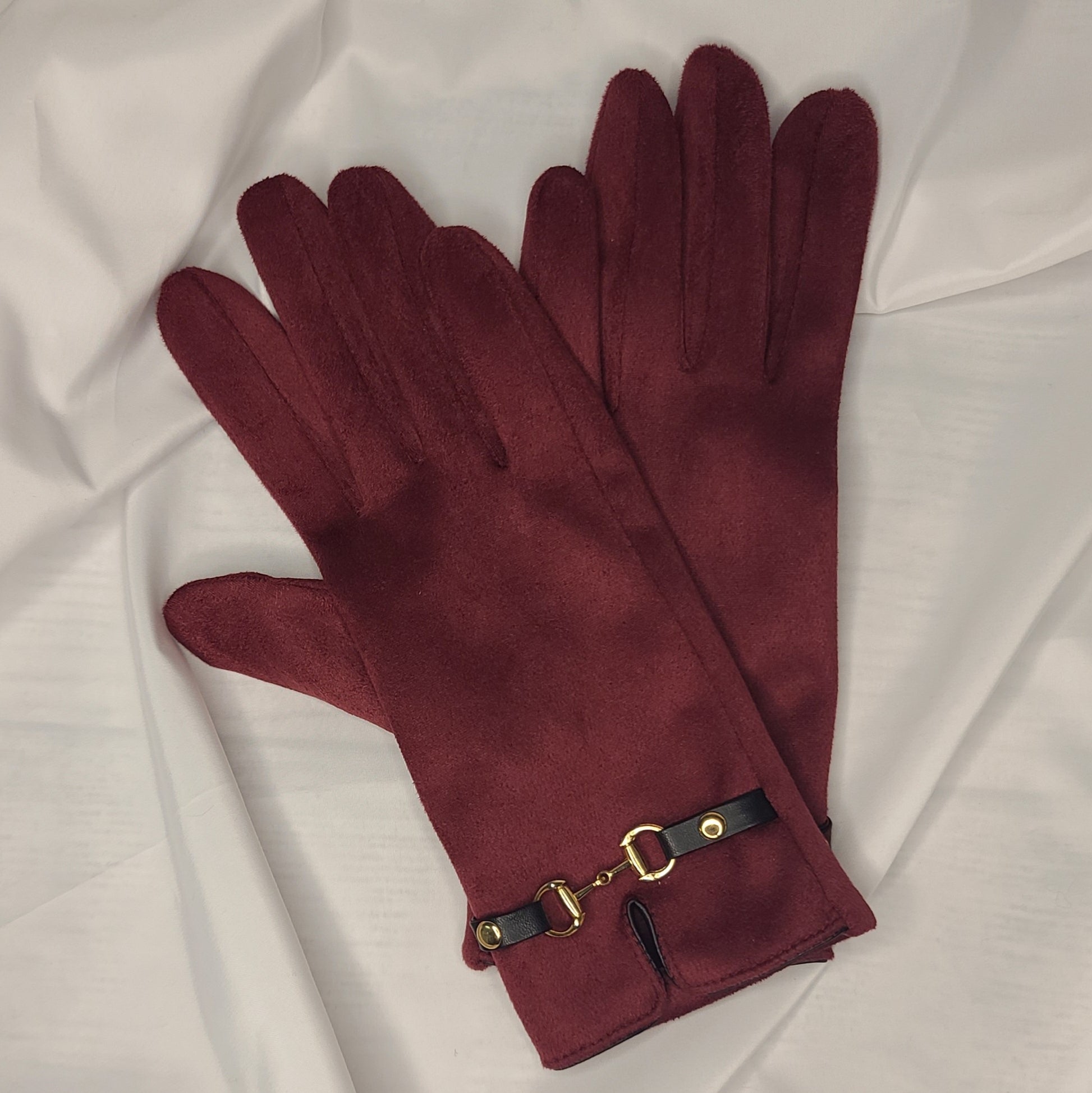 Wine microsuede gloves with a buckle accent and touchscreen compatible fingertips. Warm and cute, these gloves are perfect for crisp fall days to blustery winter nights.