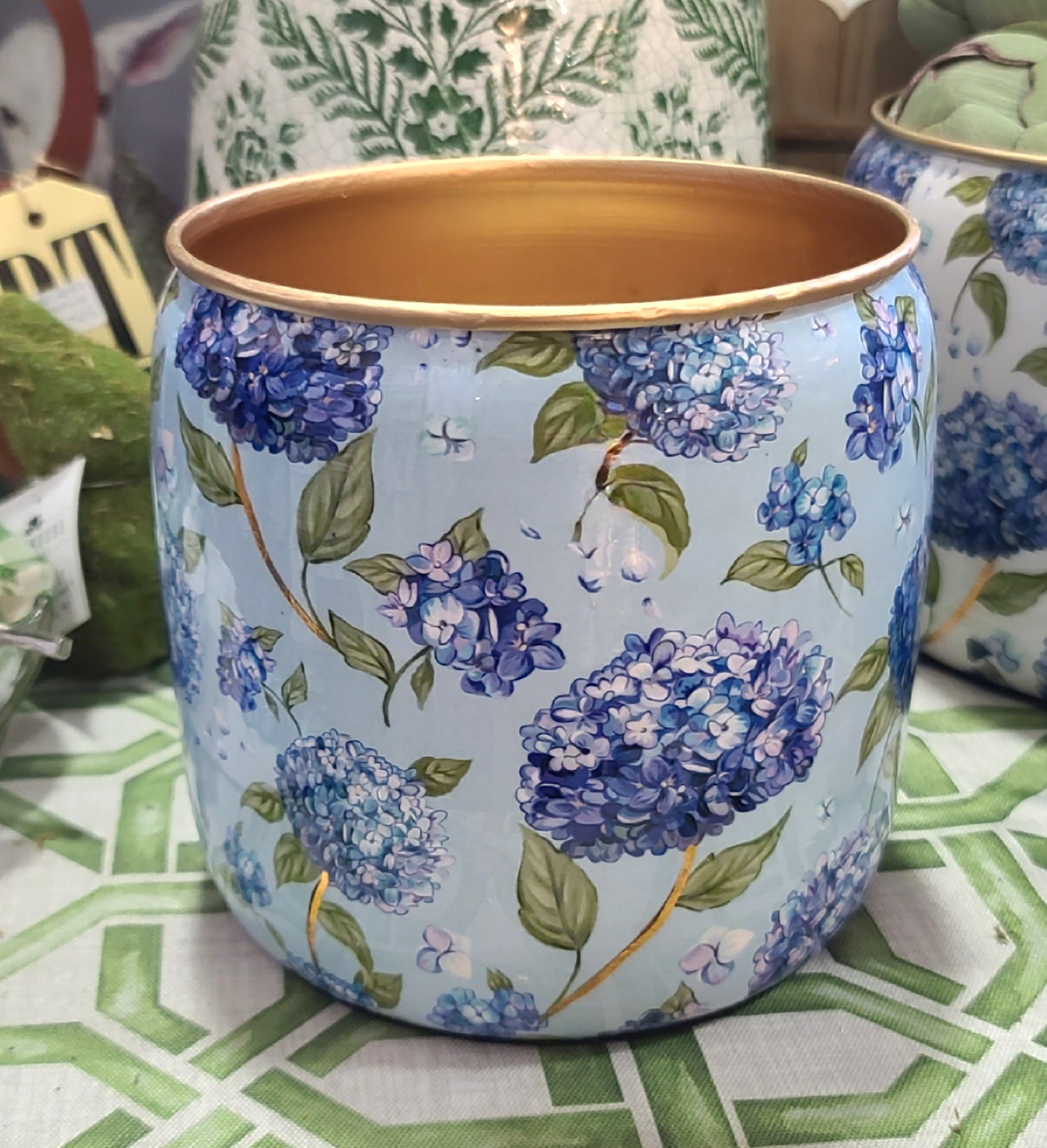 Featuring delicate blue hydrangea patterns and gold interior, these metal floral planters bring a fresh, cottage inspired feel to any space.