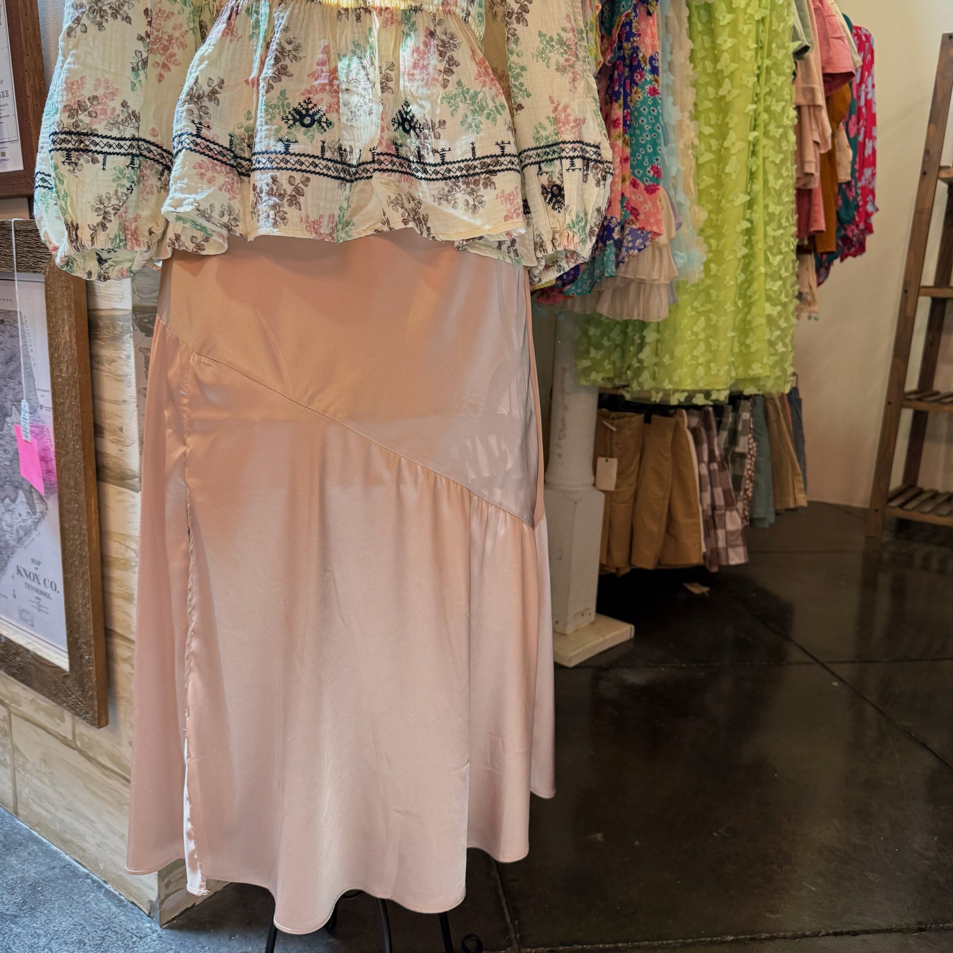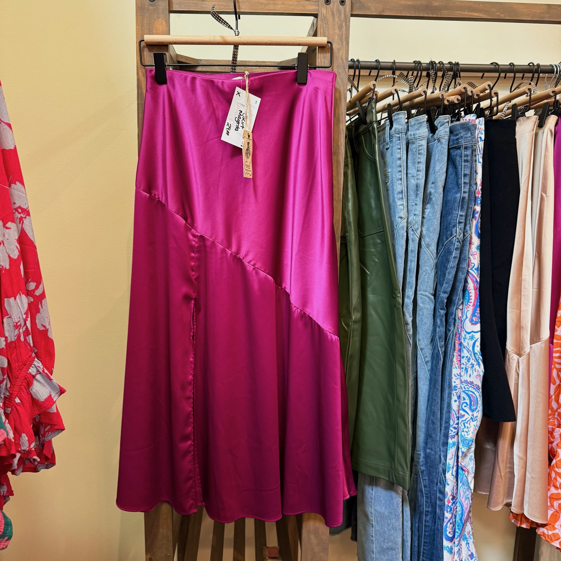 This elegant midi skirt features soft satin and an asymmetrical design. The diagonal seam creates the perfect movement and the knee length slit is the perfect accessory!