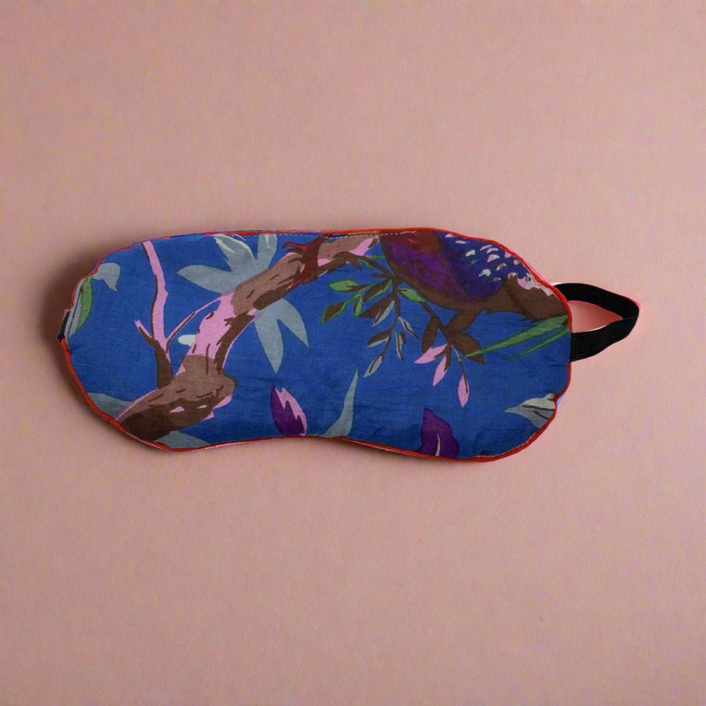 Get restful sleep with this light sleep mask in a stunning dark blue woodland pattern. Great for home or travel.