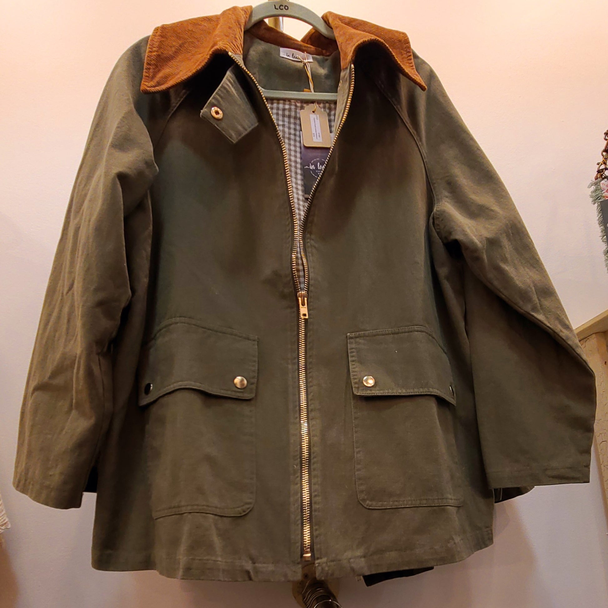 This beautiful mossy green Saddle Creek jacket with light brown corduroy collar is perfect for upcoming cold weather! A refined blend of utility and style, and such a timeless, cozy look.