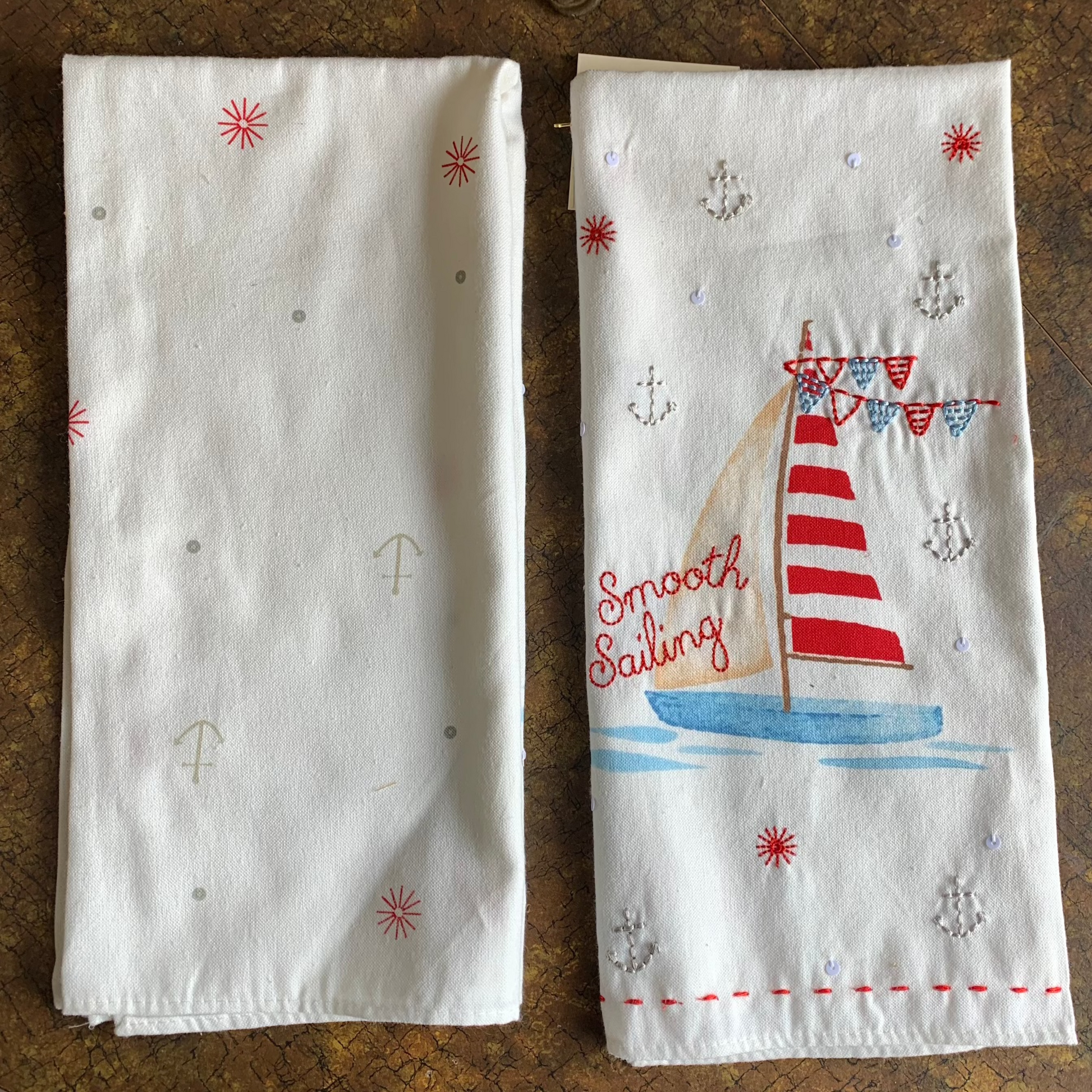 Set sail for a spotless kitchen with our "Smooth Sailing" dish towel. This nautical-themed towel features a charming patchwork design with a sailboat, anchors, and stars, all on a clean white background.