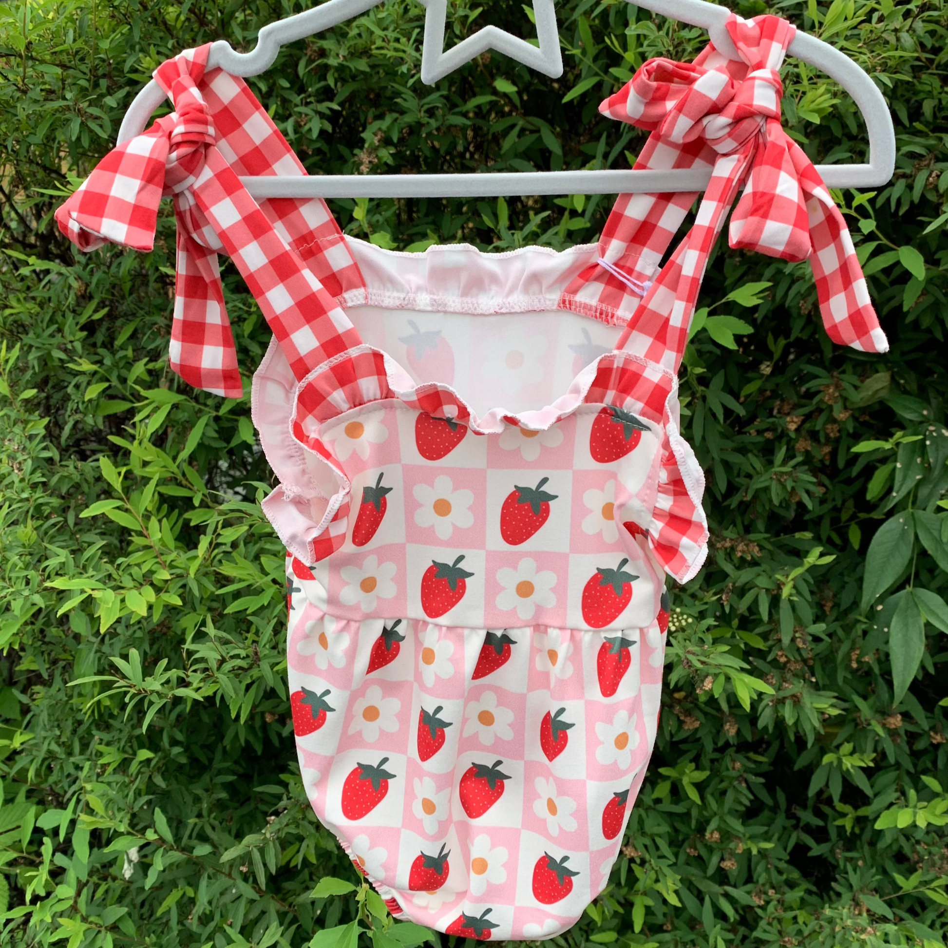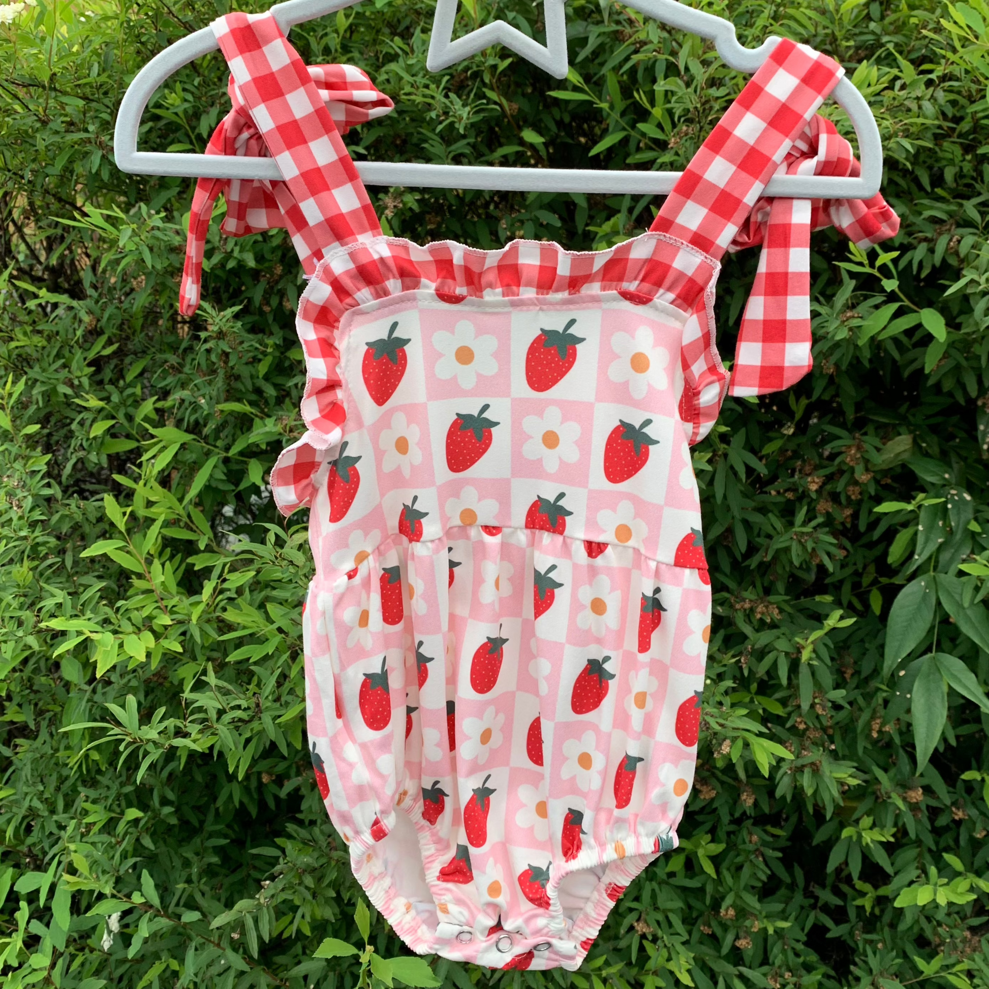 Bring on the charm with this adorable baby romper featuring a playful strawberry pattern in soft pink and red tones. Classic gingham straps add a touch of vintage flair. Lightweight, breathable, and easy to wear.