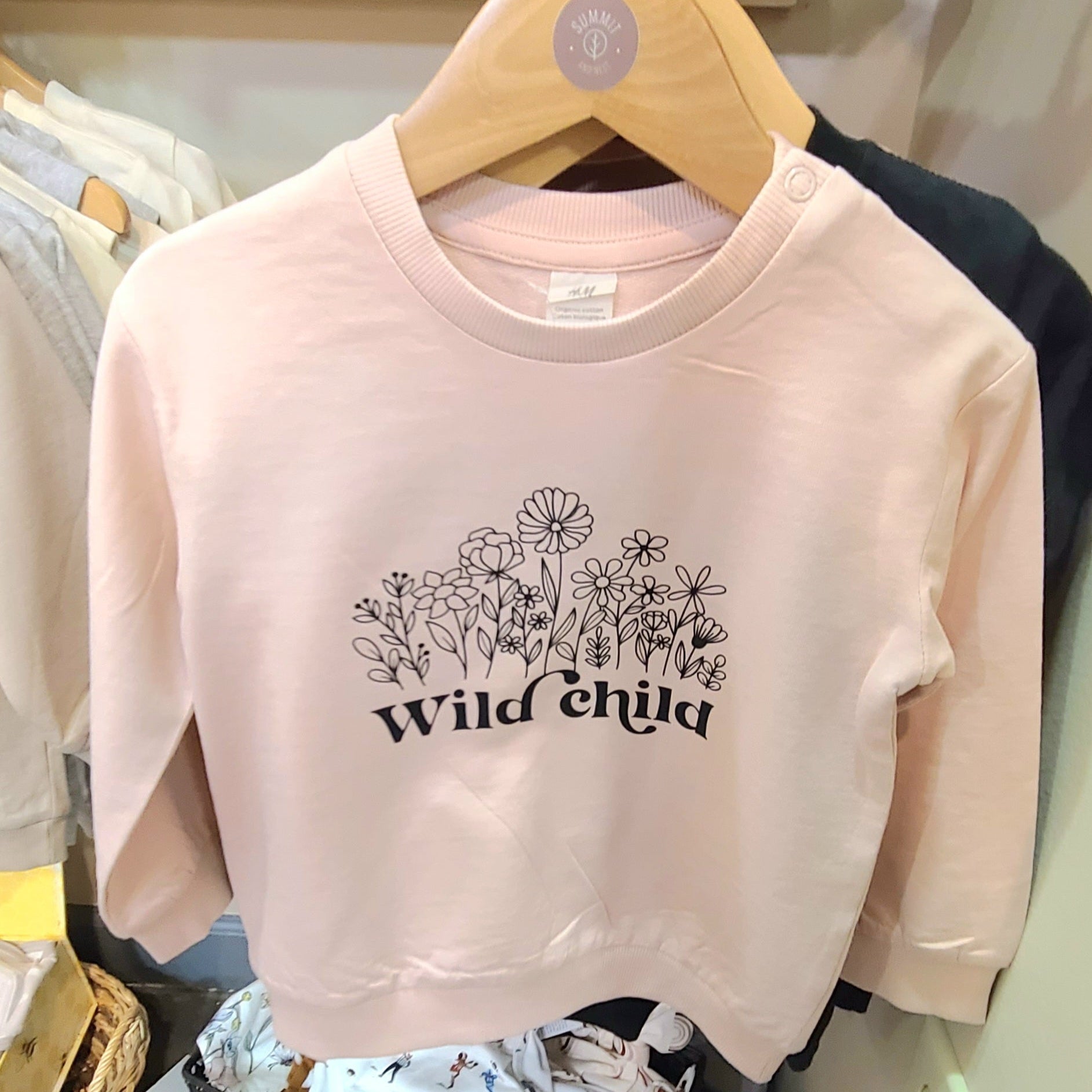 Adorable and warm, pale pink, baby sweatshirt depicting wildflowers and "Wild Child"
