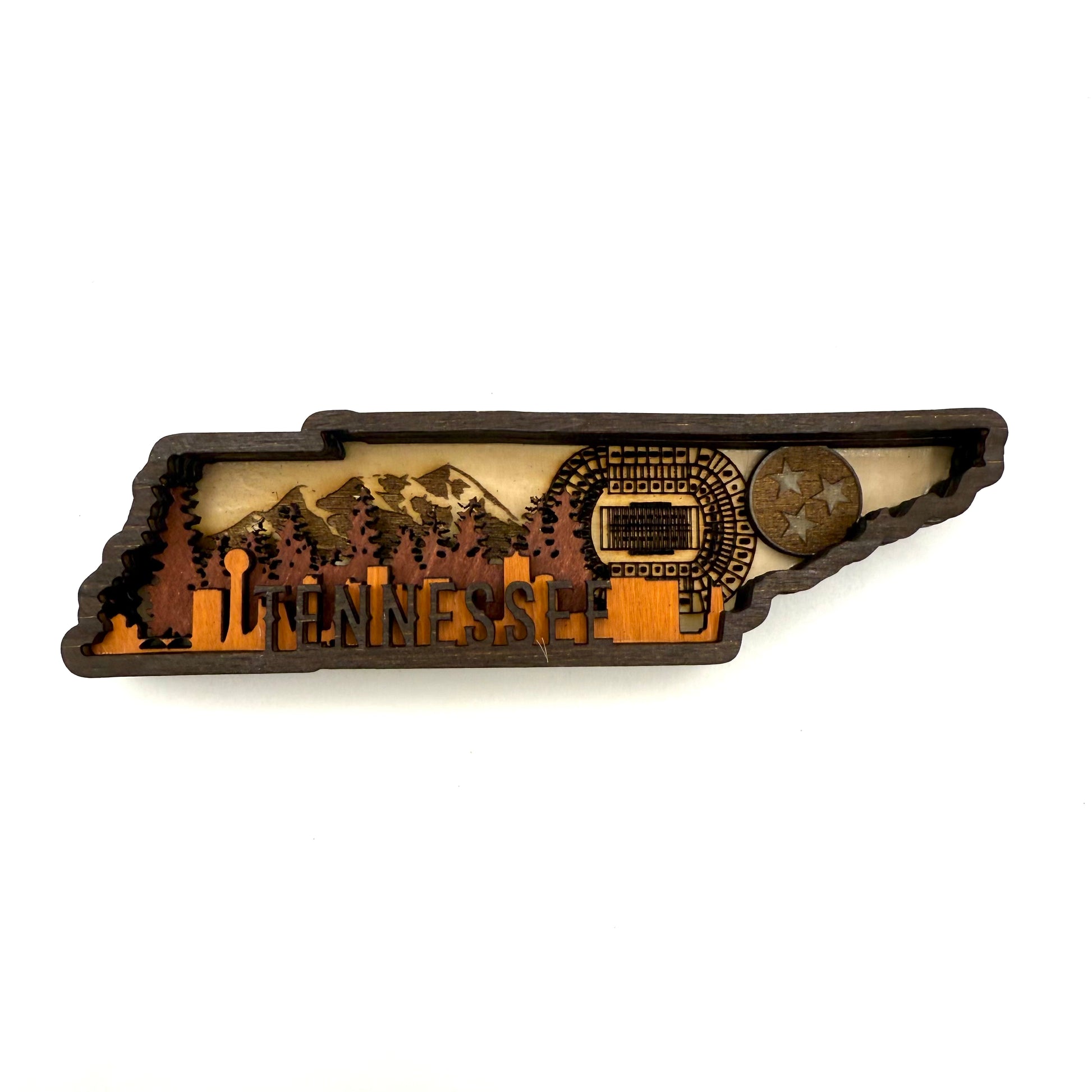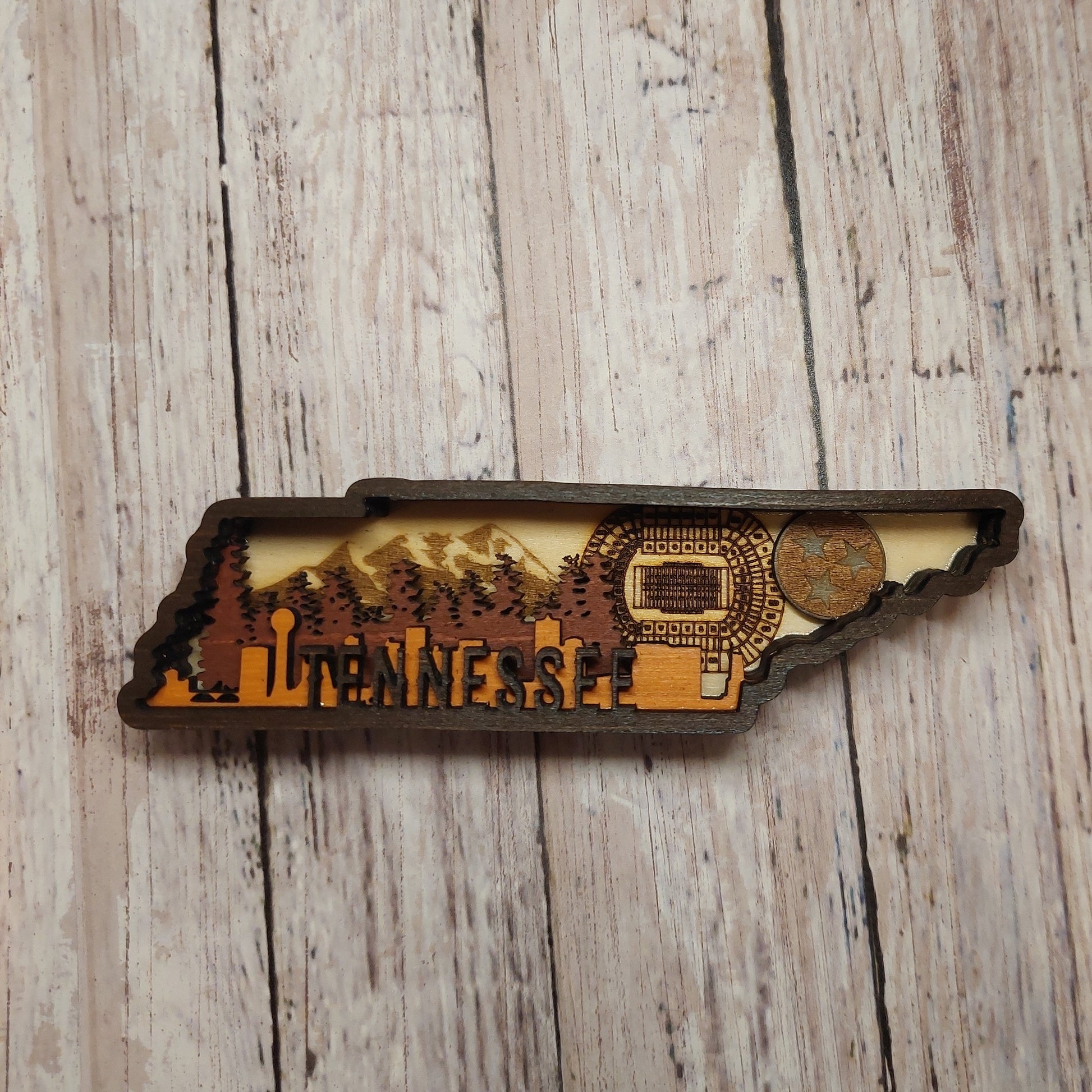This 4.5-inch wooden Tennessee magnet showcases detailed wood carvings of the TN football stadium, mountains, trees, and the Knoxville city skyline.